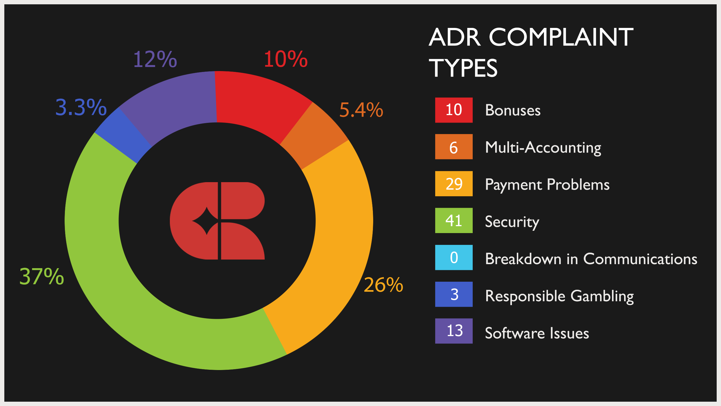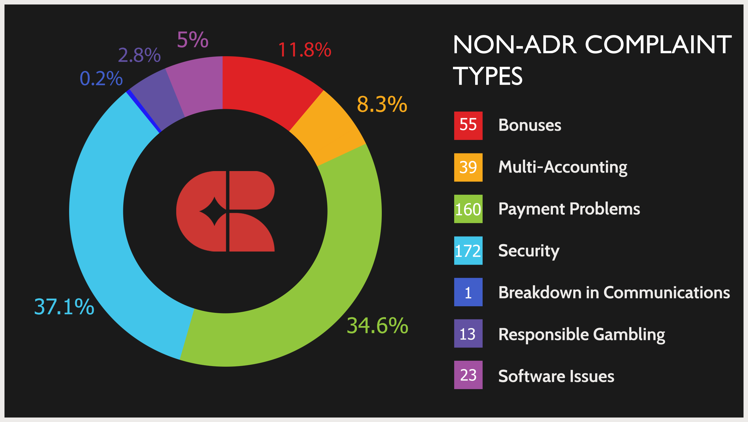 We have observed a correlation between the data sets in the categories of Bonuses and Multi-Accounting, with both ADR and non-ADR complaints showing a higher frequency of Bonus related complaints and fewer Multi-Accounting issues. This is a change from last year. Multi-accounting issues are almost exclusively related to players opening more than one account to avail themselves of bonuses that they are not entitled to receive, which in turn might push them to complain about bonus issues when they’re discovered by operators. When looked at in conjunction, these two categories represent approximately the same proportion of complaints across both data sets.