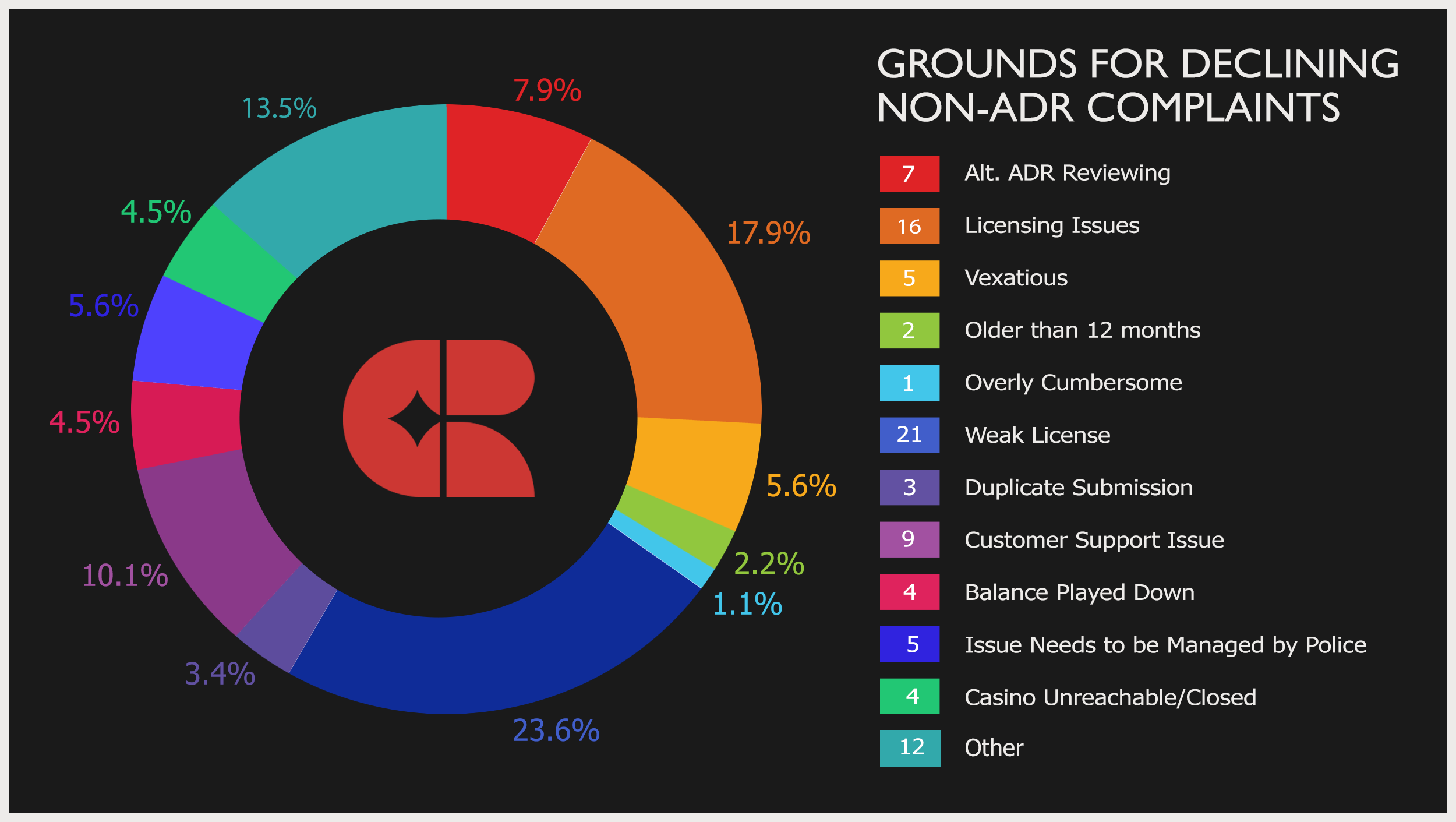 This year has seen a significant increase (+10%) in ADR complaints. This is a substantial shift, resulting in us declining a higher proportion of ADR complaint than non-ADR complaints for the first time. This shift requires explanation. When the ground for declining complaints are examined, it can be clearly seen that this rise in declined ADR complaints is accounted for almost entirely in the 'Licensing Issues' category. These complaints generally relate to players from EU countries that have their own licensing system looking for us to uphold their national licensing rules over the MGA licensing standards. As an ADR appointed to manage complaints for MGA licensees, our function is to enforce the MGA licensing standards. We are not empowered to enforce the licensing standards of other regimes and as such have no option but to decline these cases and direct the player to contact the appropriate systems within their national regulatory system to pursue their case. The growth in this type of submission reflects the amplified political discord between the MGA and national regulators across Europe.